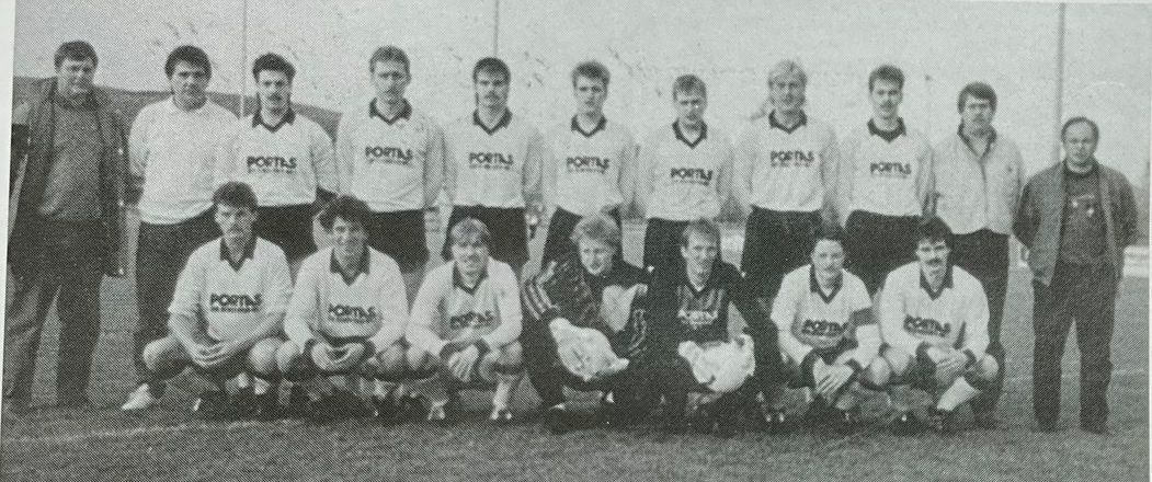 Die Meisterelf und Pokalsieger aus dem Spieljahr 1982/83. Stehend v. links: Erhard Lang (Spielausschuß), Erich Kuhlmann (1. Vorsitzender), Bernd Freund, Armin Schneider, Siegfried Lenz, Mario Ulm, Hans-Ge- org Pitz, Ralf Wurtinger, Herbert Loth, Reinhard Parnitzke, Werner Rösner (Spielausschuß), Siegbert Lotz (Spielausschuß). Knieend v. links: Alexander Lenz, Burkhard Schumann, Ulrich Seibel, Jürgen Fehst, Erwin Schneider (Spielausschuß). Die Aufnahme erfolgte nach dem Pokalsieg.